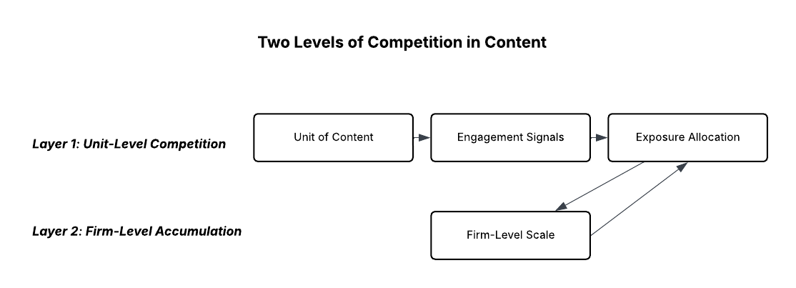 At the most immediate level, competition in the content or creator economy occurs at the level of the individual content unit. Whether a video, a post, a podcast episode: each individual unit enters the allocation system independently. Platforms do not (in most cases) allocate exposure based purely on who the creator is. They allocate exposure based on how the individual piece of content performs.