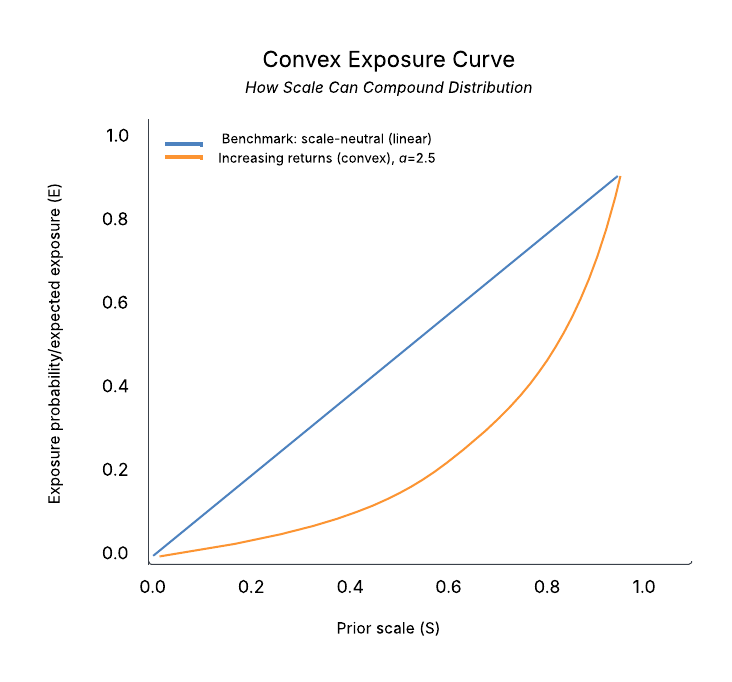 Fig.2 The straight line represents a scale-neutral system: prior scale increases exposure proportionally. In such a system, doubling your size doubles your exposure.