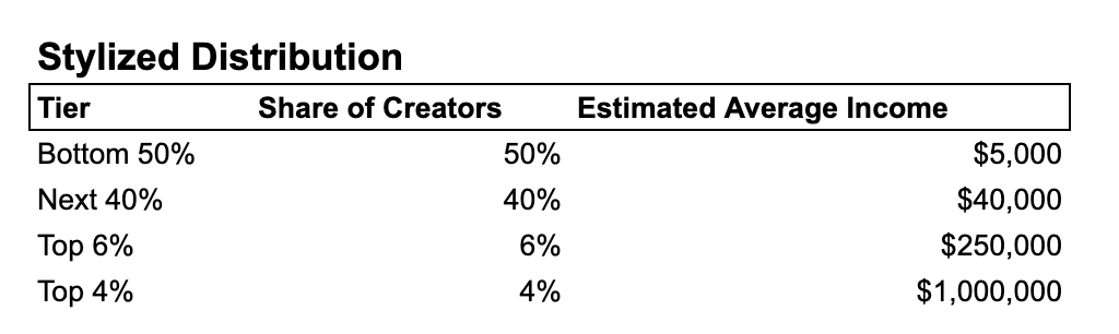 I know what you might think, those numbers alone imply skew. A market where the median is $15,000, but a visible subset earns millions is not symmetrically distributed. To estimate concentration meaningfully, we need to approximate total creator earnings and distribution tiers. Again, I cannot stress enough that this is using non live-time data and the data given to us. So we’re going to build a conservative model.